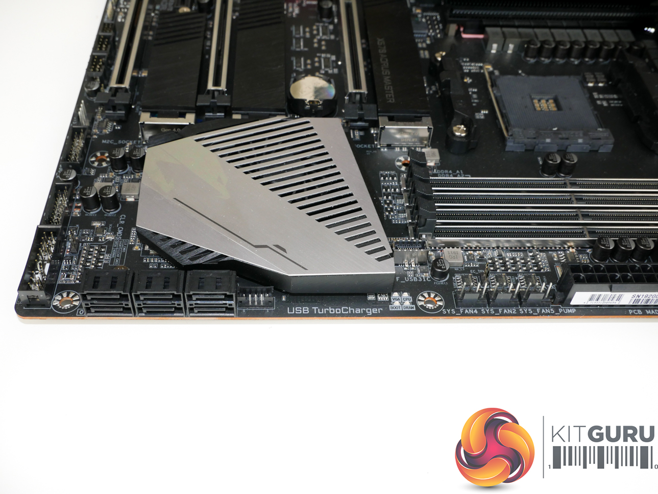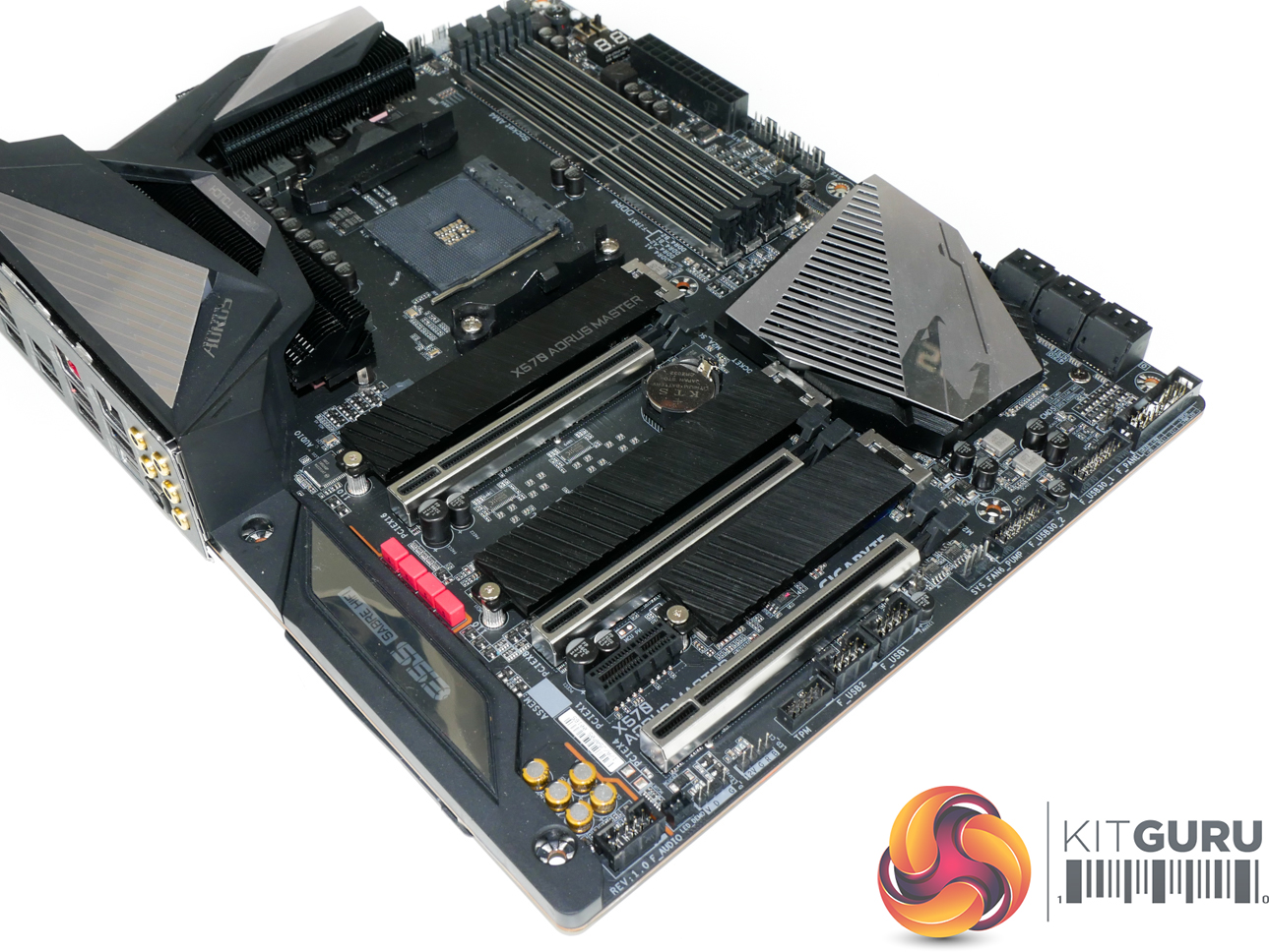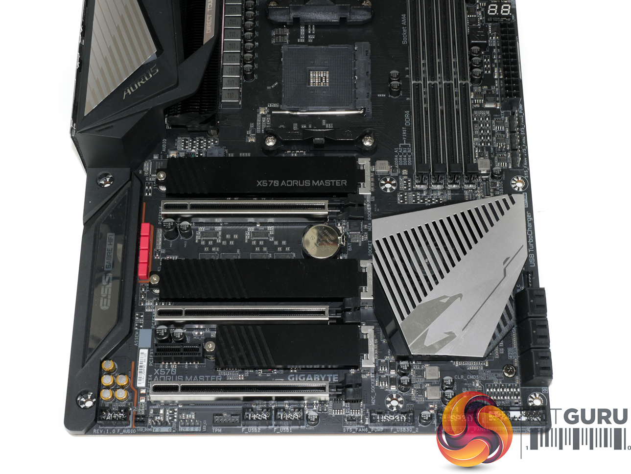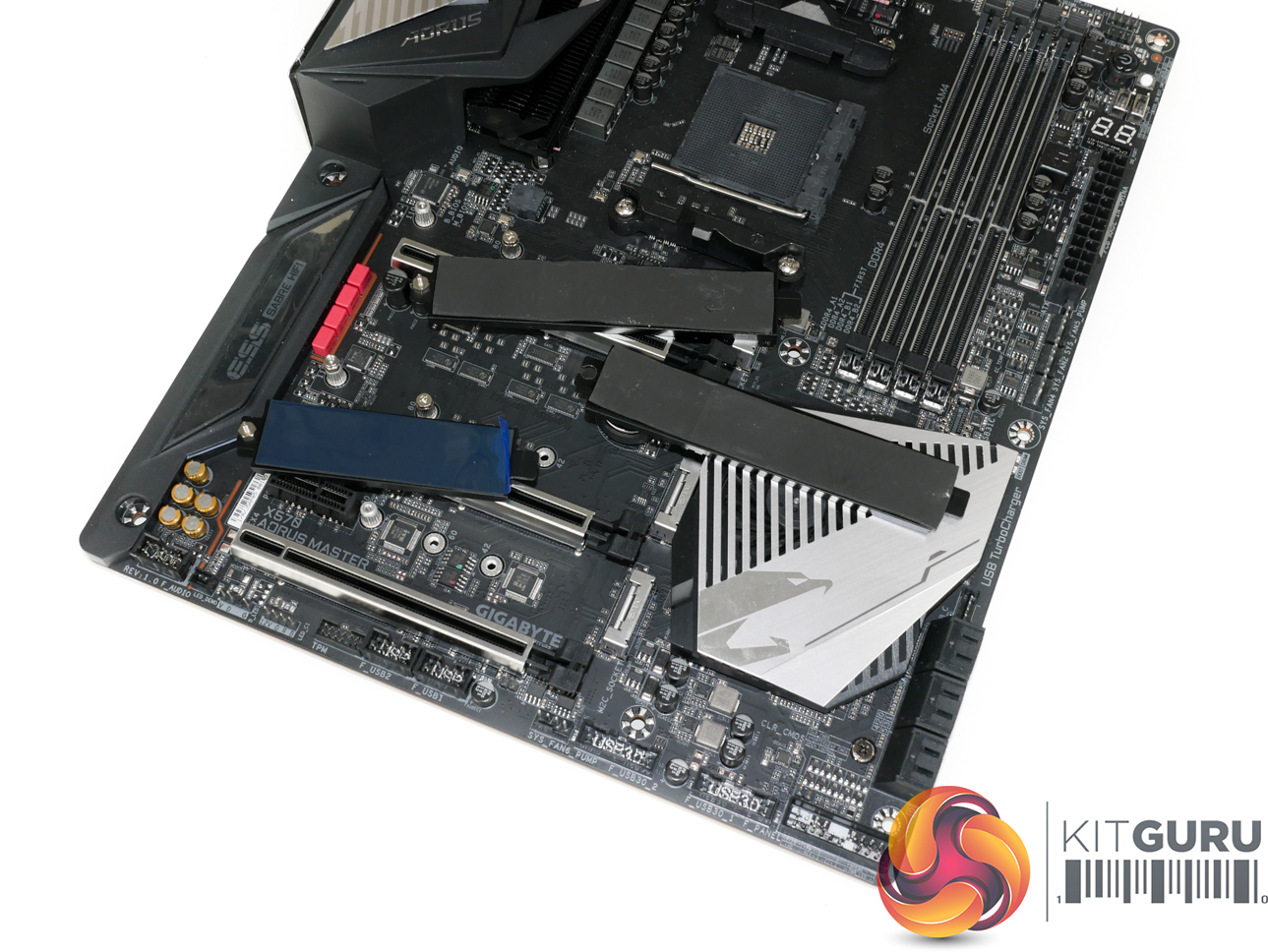 Gigabyte deploys a total of three M.2 slots, two of which support drives up to 110mm in length. Both SATA and PCIe drives are supported in each of the slots and they all get a solid lump of metal and thermal pad to aid with drive cooling.