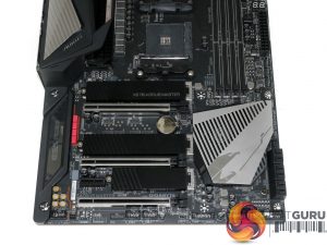 The uppermost slot gets its PCIe 4.0 x4 or SATA connection from the AMD CPU, while the remaining two are fed by the X570 chipset. As previously highlighted, you’ll want to use the top slot first, then the second, then the third as the lowermost one shares bandwidth with two SATA ports. All three ports could be used together for an impressive RAID array.