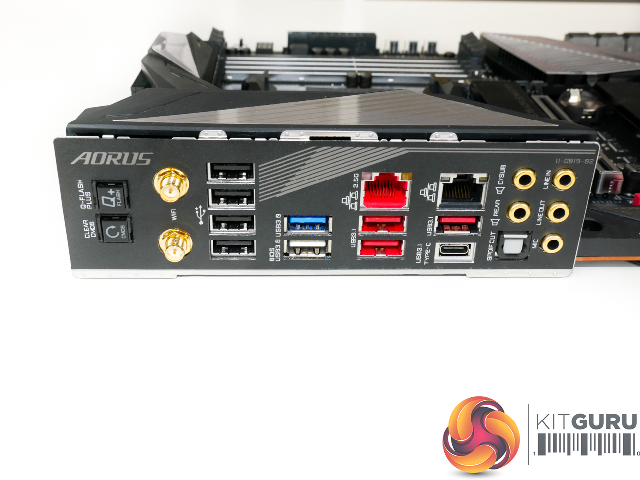 Even given the competition at this price point, the rear IO port selection on Gigabyte’s X570 Aorus Master is healthy. Firstly, the use of an integrated IO shield is excellent. There’s no onboard video connection for use with APUs but I do not see this as a realistic use case for an enthusiast-geared X570 board. So, no negatives marks there.