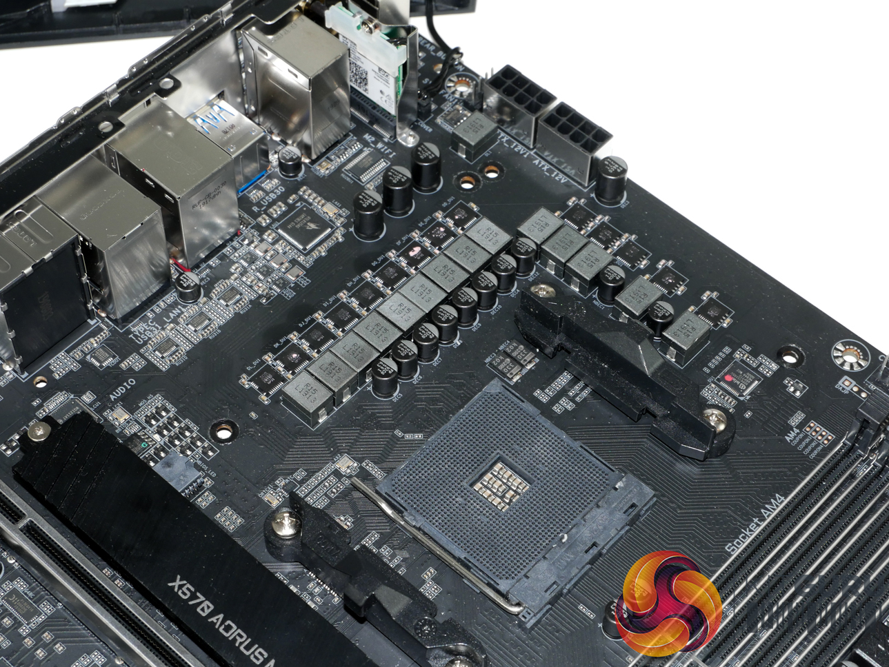 Importantly, given the amount of power that high core count AM4 chips can push through the dual-8-pin connectors and CPU socket, Gigabyte deploys a well-designed, finned heatsink to dissipate heat losses from the integrated power stages. This is imperative in maintaining efficient and high-performing operating temperatures for the high- and low-side MOSFETs found within the electrical components.