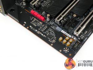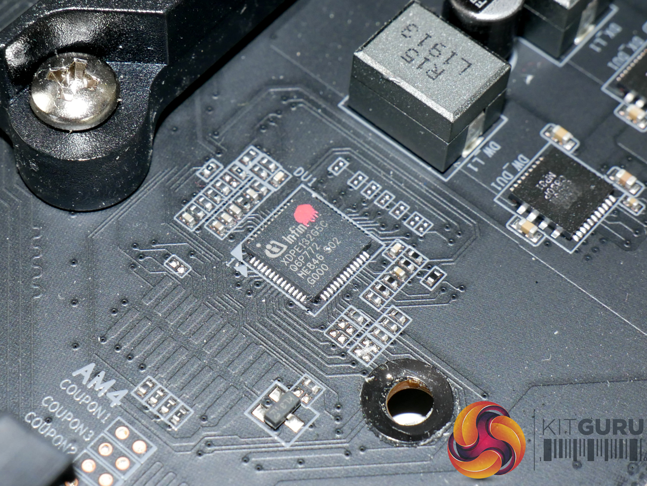 That PWM chip is noteworthy as it is a true 16-phase controller manufactured by Infineon. It is not simply a lower-phase-count unit that is bolstered by doublers, which is what we’d typically see from the common Intersil or International Rectifiers solutions found on competing motherboards.