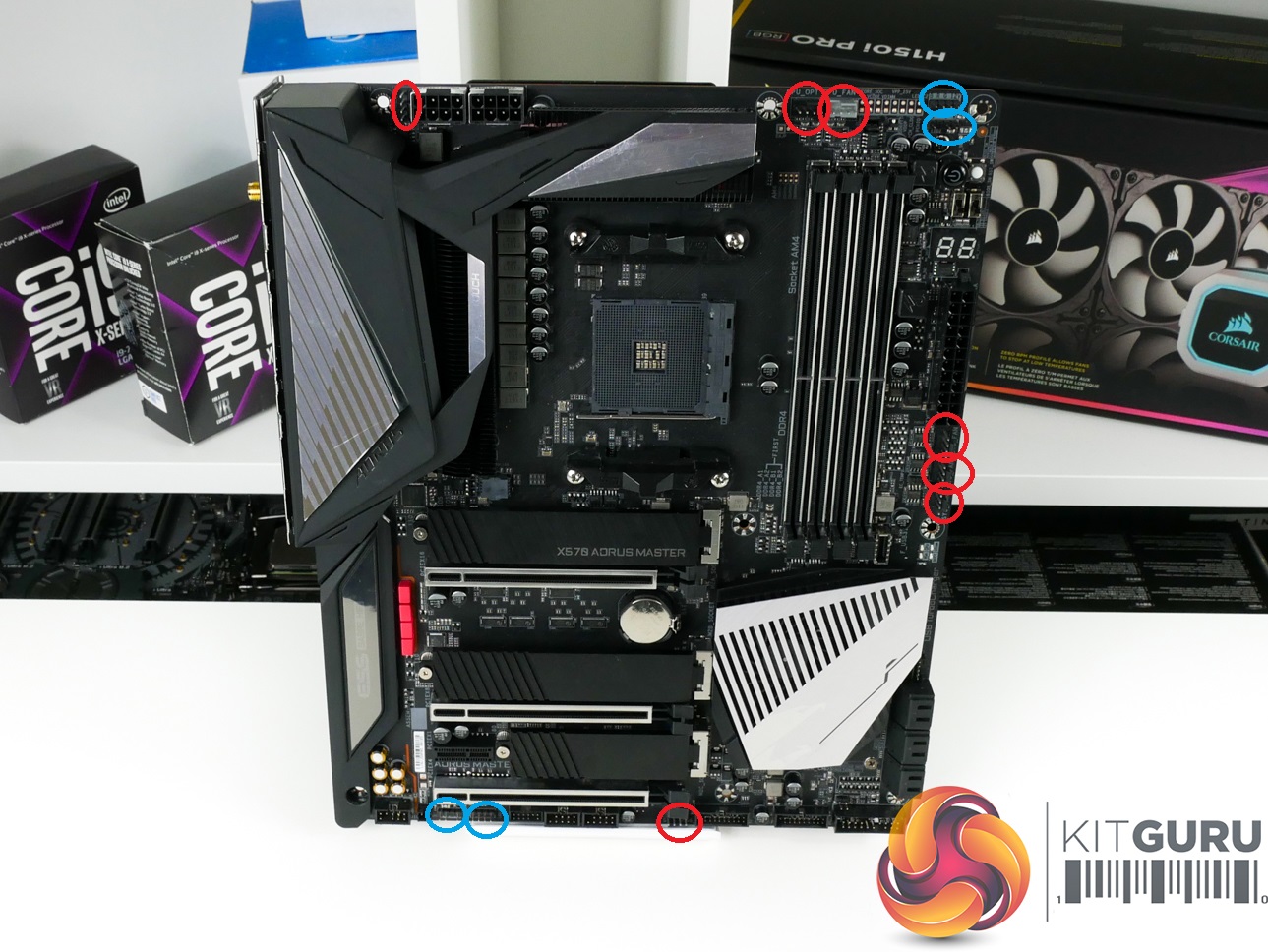 A sizeable total of seven 4-pin fan headers is spread around the motherboard. Six are within easy access of the CPU socket, two of which are preferred for CPU control duties. The final one is laid along the motherboard’s bottom edge. All of the headers are near the edge of the board which makes cable management far easier.