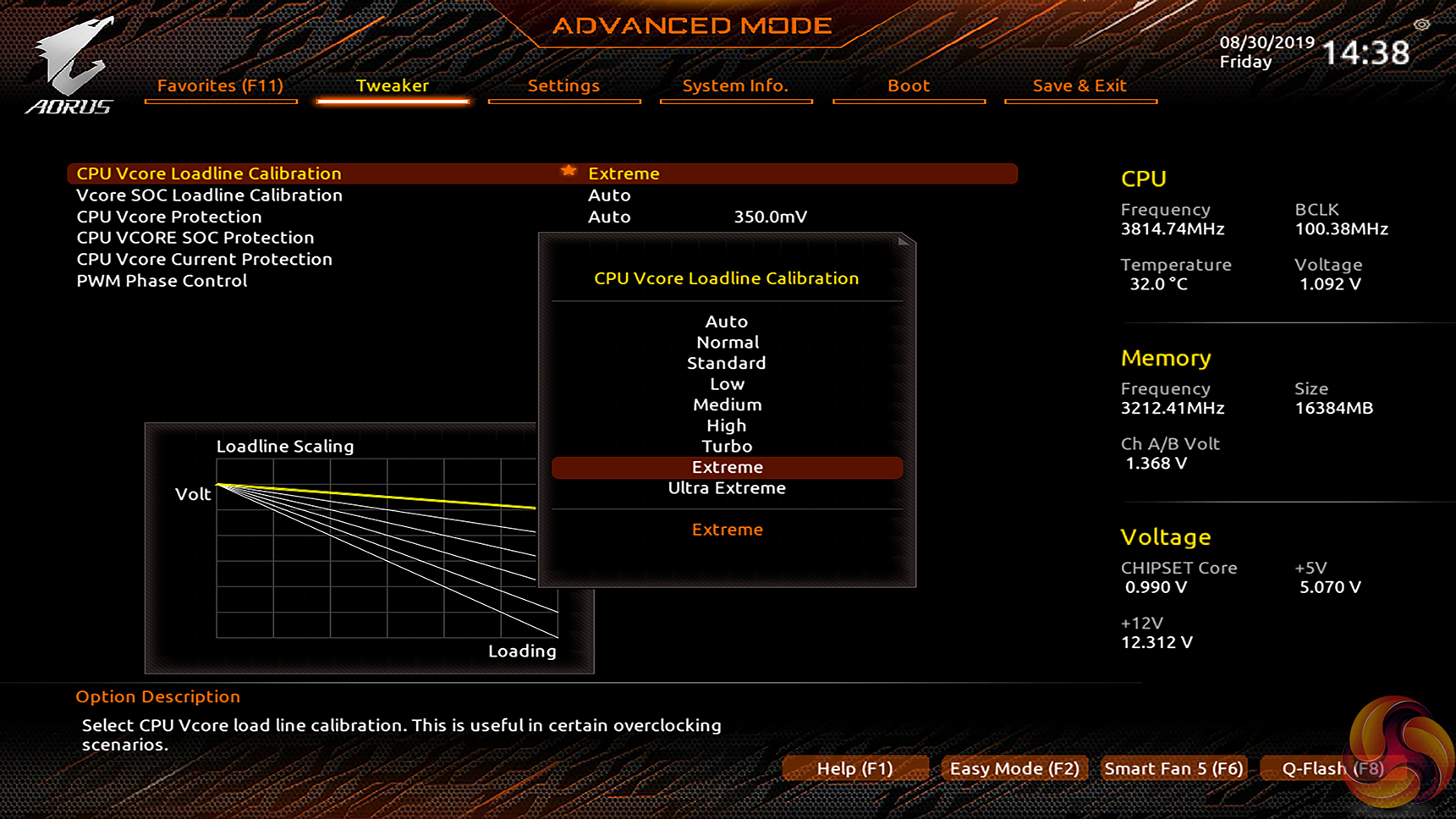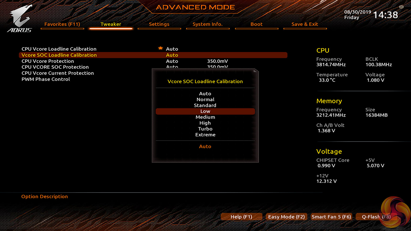The selection of LLC names doesn’t really make sense. However, Gigabyte makes up for this by including the (critical in my opinion) visual graph that shows how some of the LLC settings operate. As it happens, our trial-and-error testing suggests that you should use the High LLC setting if you want CPU VCore to stay close to your applied numerical value without a significant overshoot or undershoot.