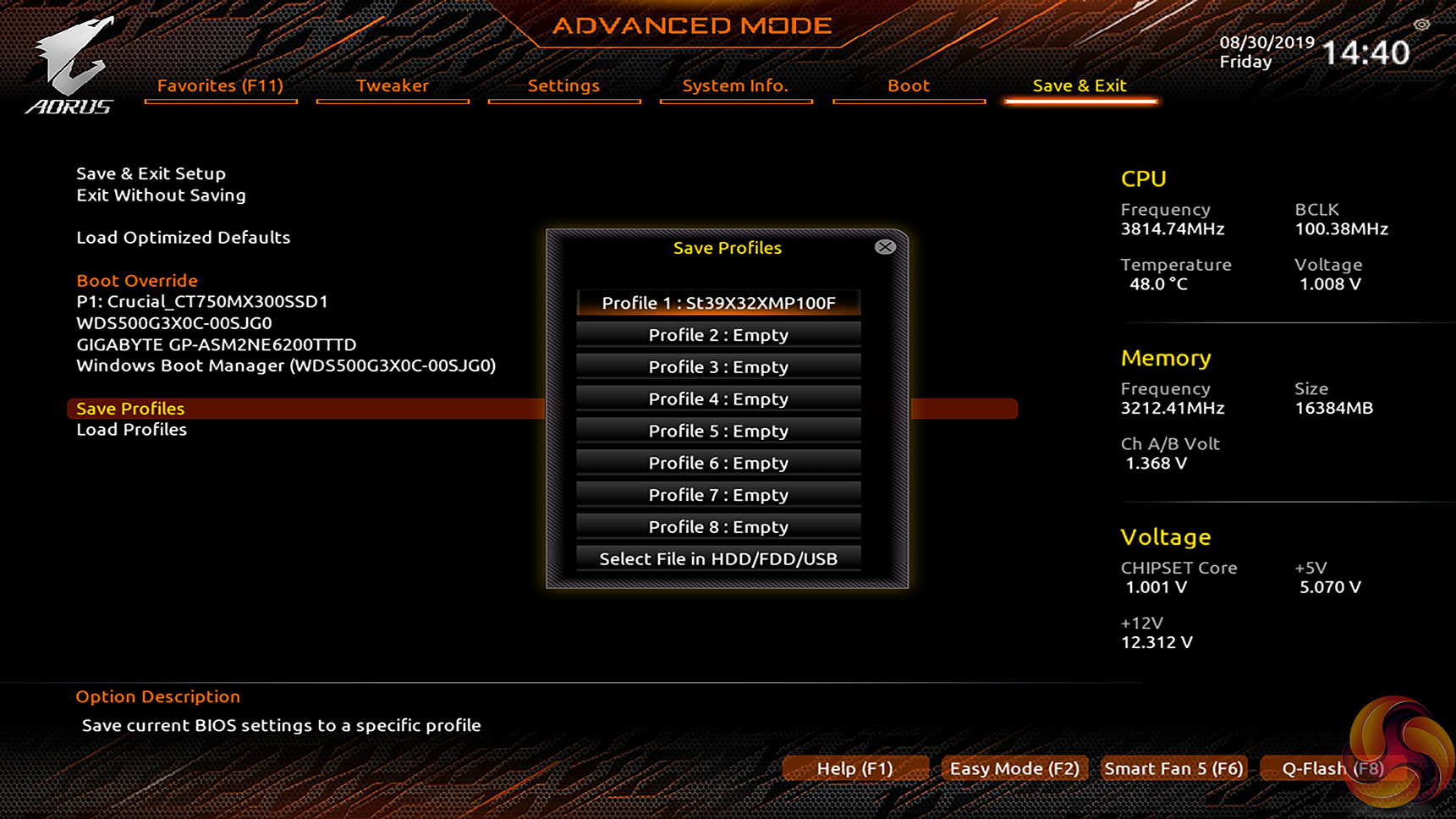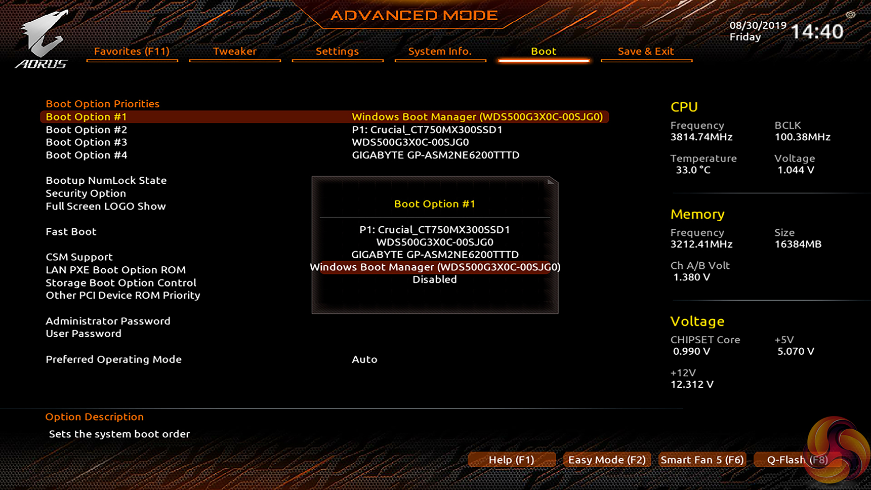 Gigabyte’s Easy Mode page is a quick-access area where users can alter the boot sequence, check fan speeds, monitor temperatures and voltages, enable XMP, and change the performance mode without jumping into the deeper (and scarier for less experienced users) UEFI sections.