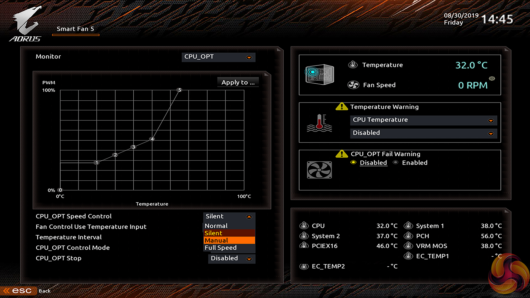 It’s the manual fan speed tweaking mode where Smart Fan 5 really shows its worth. Six points on a graph can be used to create the fan speed curve. A level as low as 0% PWM speed down to 0°C is also supported, meaning that you can set the fan to switch off if the system is operating at ambient, or elevated, temperature (provided the fan is able to stop itself spinning).