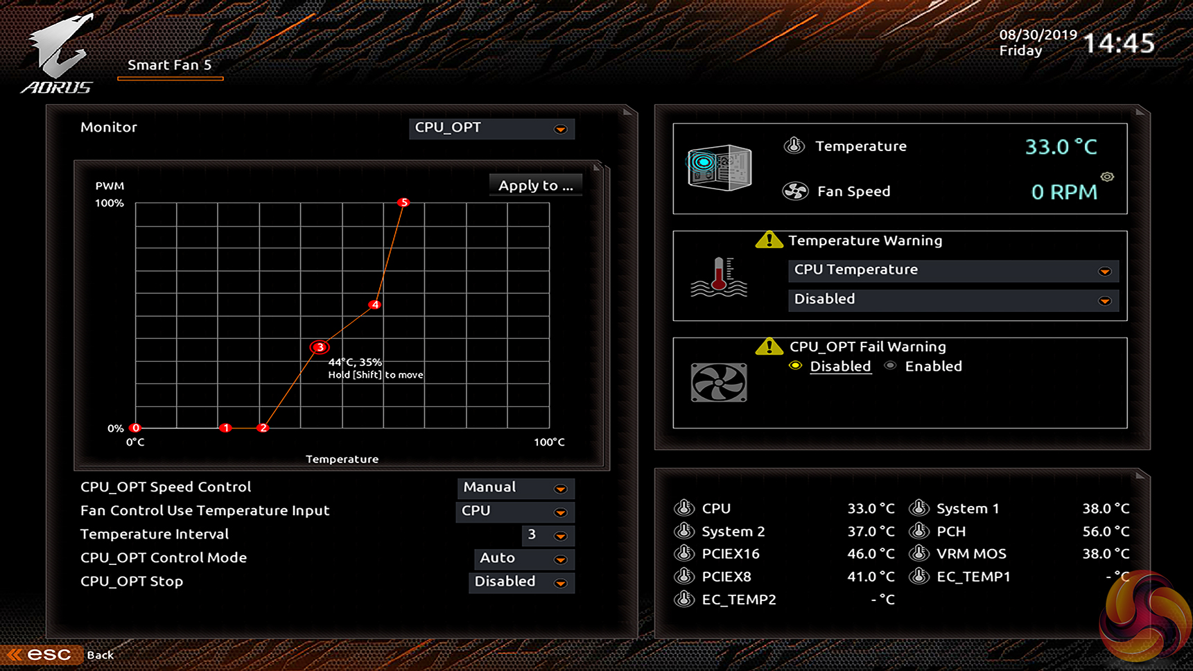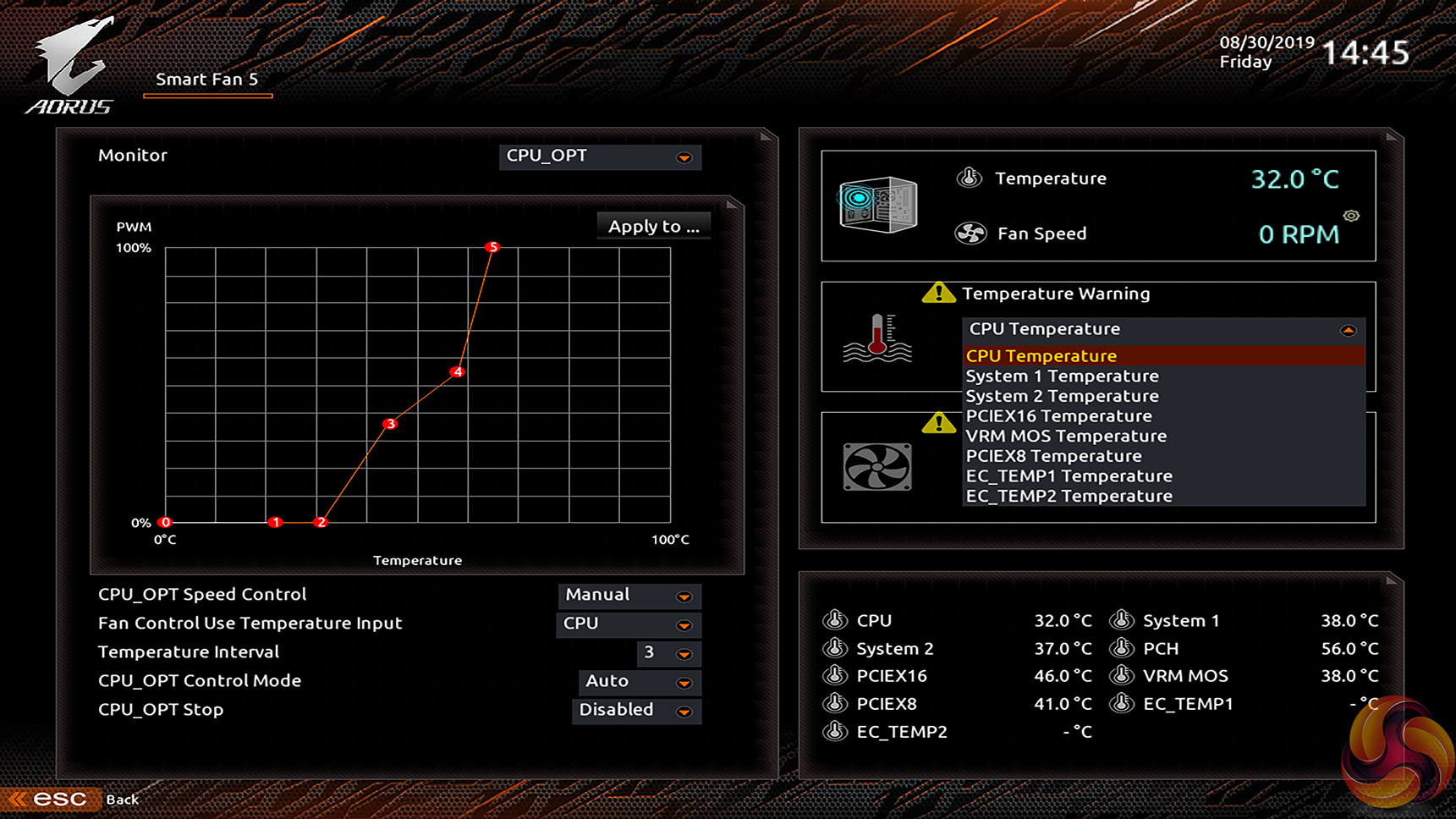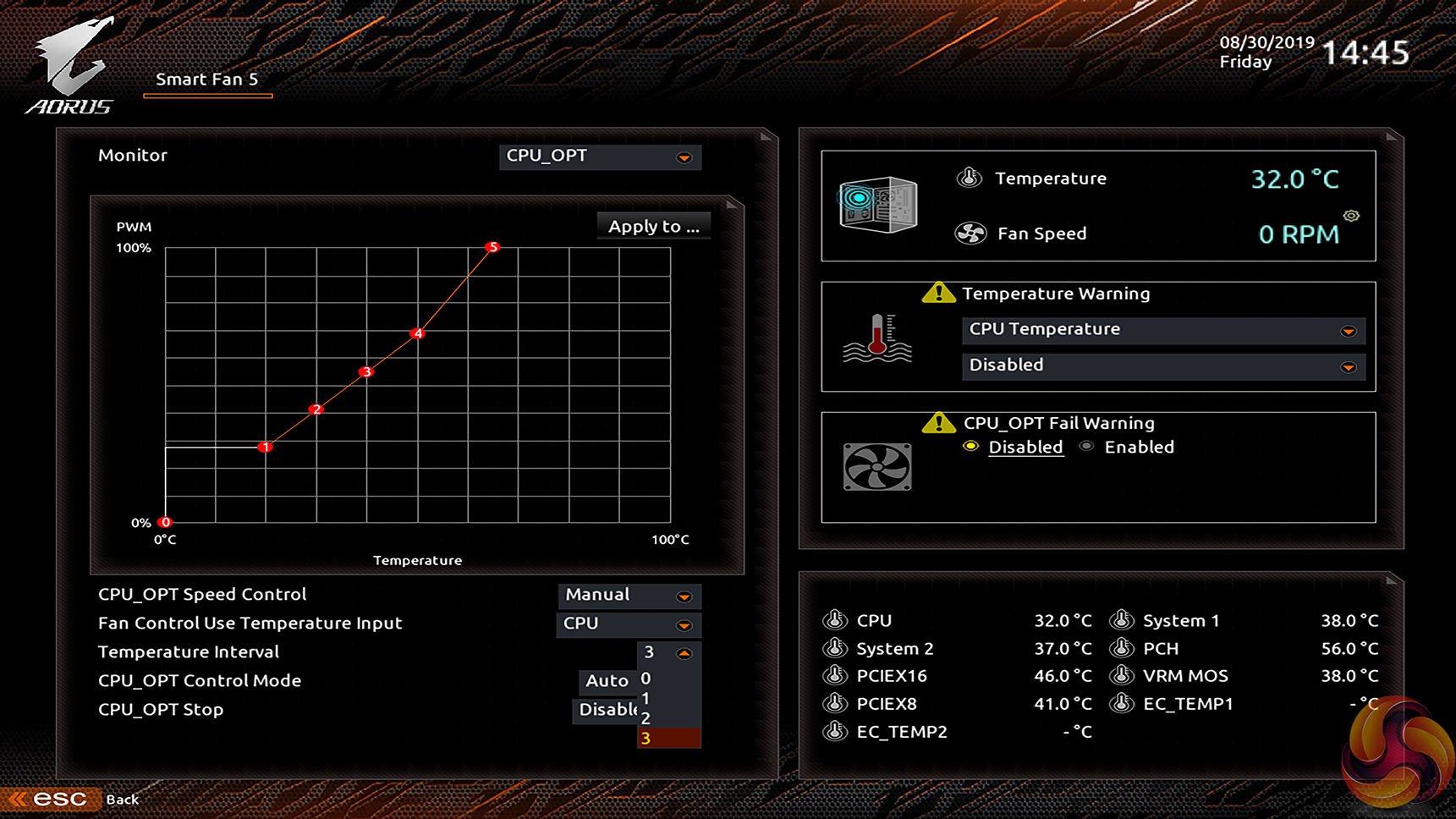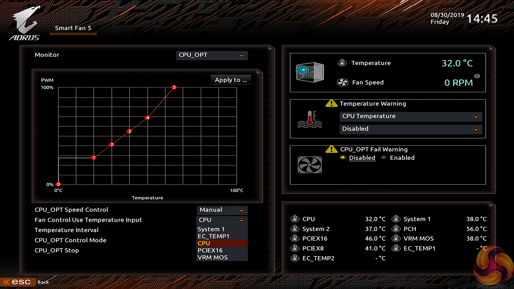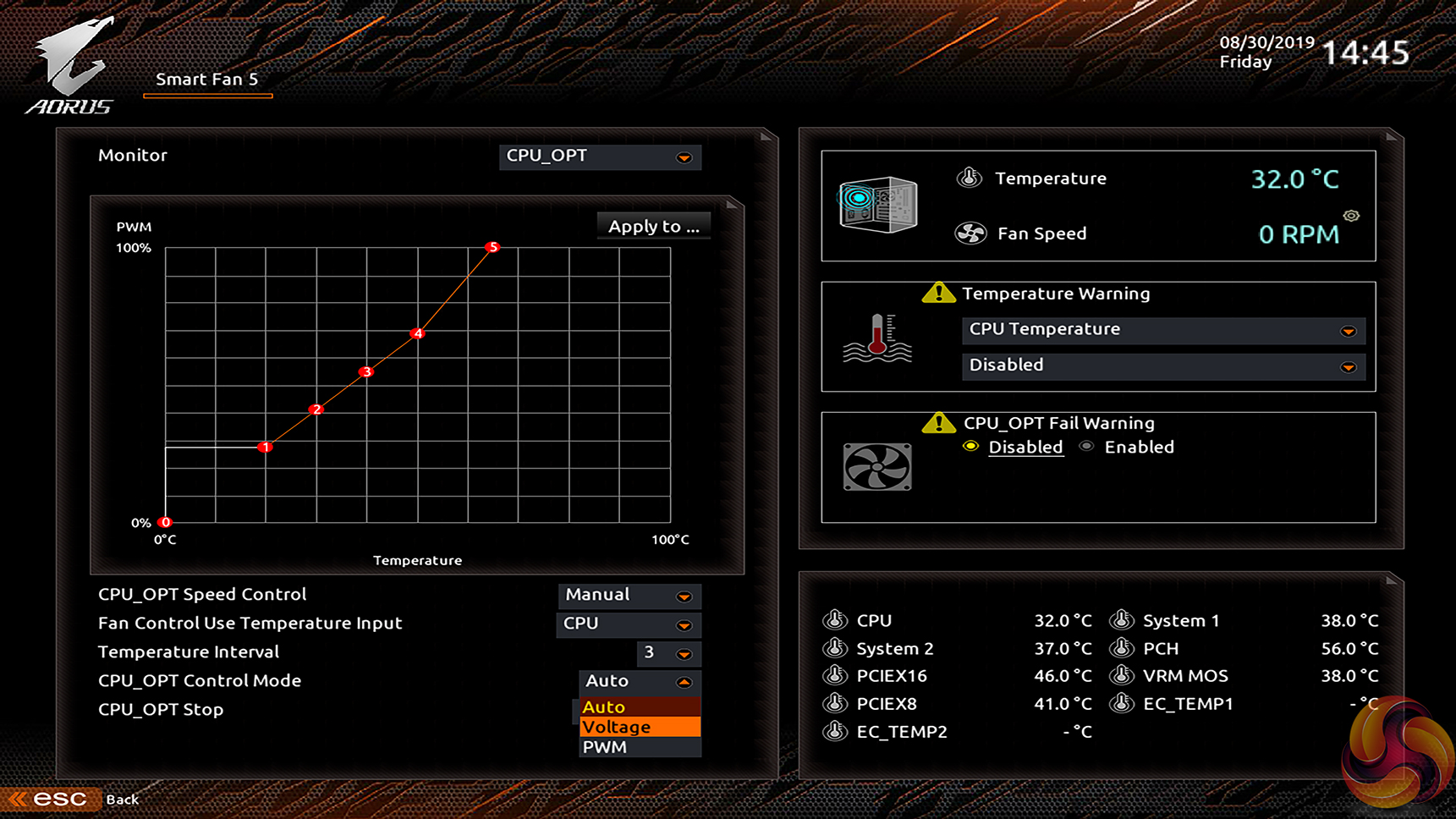 All fan headers can be individually selected and their speed profiles can be tweaked. Gigabyte includes basic preset fan speed control settings and a choice of temperature monitoring points. The headers can also be set to PWM or Voltage (DC) mode at will, which is ideal for feeding continuous current to a watercooling pump or letting PWM fans adjust their own speed.