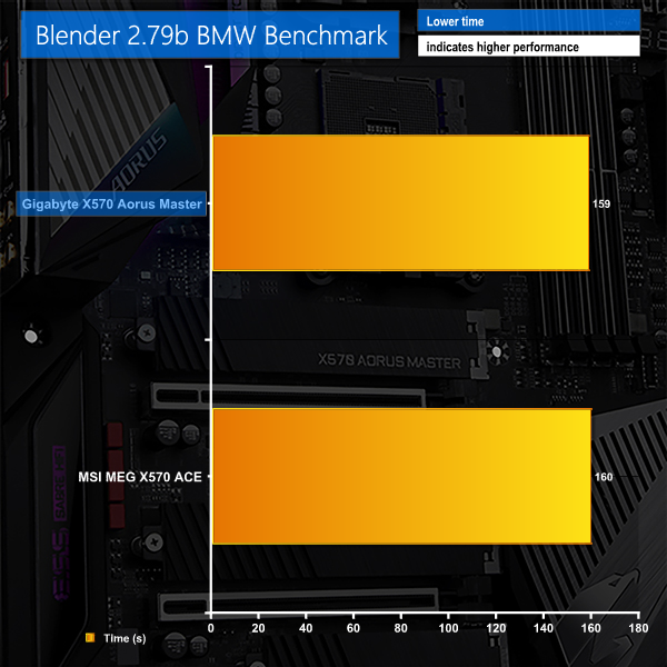 Another performance victory for Gigabyte in the Blender test, though this time the performance lead is marginal. 1 second is not much on a 159 second render, so you’d have to be doing a lot of rendering to care about this performance difference.