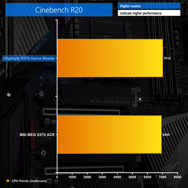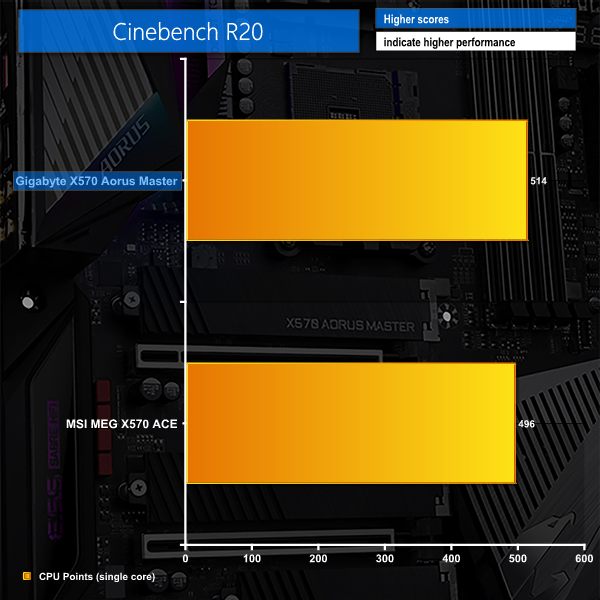 Starting off with Cinebench multi-core, we see the Gigabyte X570 Aorus Master outperforming its MSI competitor by around 1%. Our logs show that clock speed for this sustained multi-core workload hovered around 4000-4025MHz throughout the benchmark run.