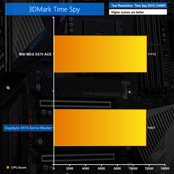 3DMark Time Spy shows the Gigabyte X570 Aorus Master slightly trailing the MSI competitor. The difference in CPU score is 82 points or a barely-noticeable 0.7%.