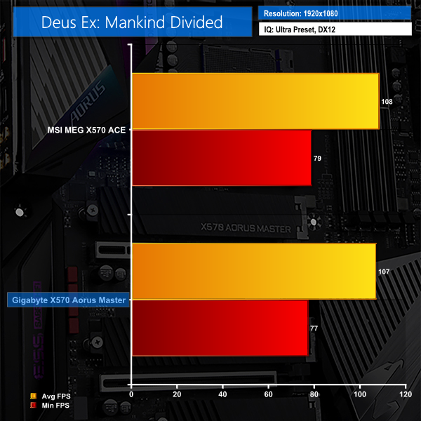 Deus Ex and Shadow of the Tomb Raider also showed slightly reduced performance for the Gigabyte board versus MSI’s. Deus Ex was 1 FPS slower on average for Gigabyte while the minimum FPS score was 2 FPS slower.