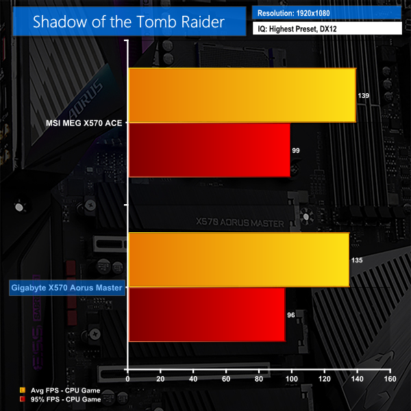MSI was also a little faster than Gigabyte in Shadow of the Tomb Raider. The X570 Aorus Master averaged 135 FPS – 4 FPS slower than the MSI MEG X570 ACE. These are minor differences but certainly worth highlighting, nonetheless.