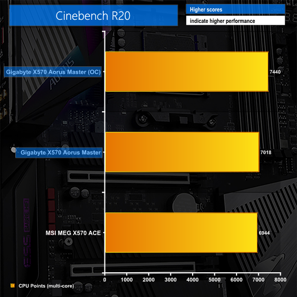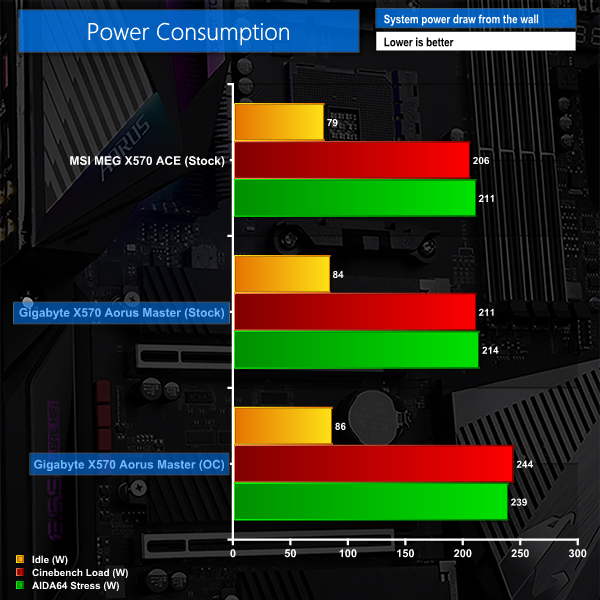 Unsurprisingly, given its slightly higher performance thanks to higher boost clock speeds, Gigabyte’s X570 Aorus Master draws slightly more power than the MSI competitor. With that said, there’s only a handful of Watts in the difference between these two motherboards.