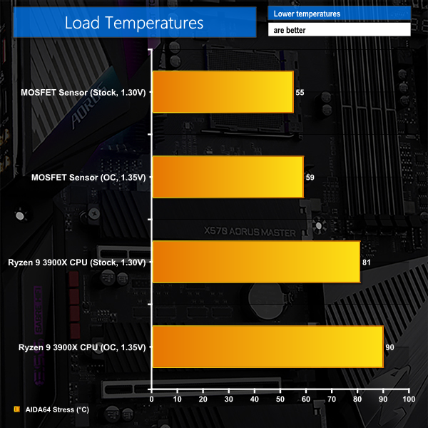 Gigabyte's VRM heatsink does a superb job at managing the heat thrown its way. Even with a 1.35V overclock on the Ryzen 9 3900X (and validated with a multimeter), the MOSFET sensor stayed at a maximum of 60°C after 1 hour of heavy AIDA64 stress testing. And that's just with the incidental airflow from a Corsair H100X AIO in an open test bench configuration, not a chassis or air cooler with better airflow scenarios.