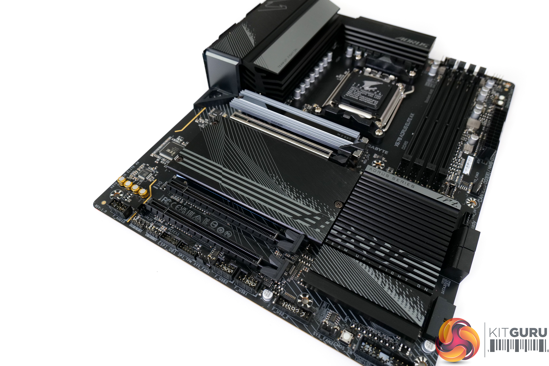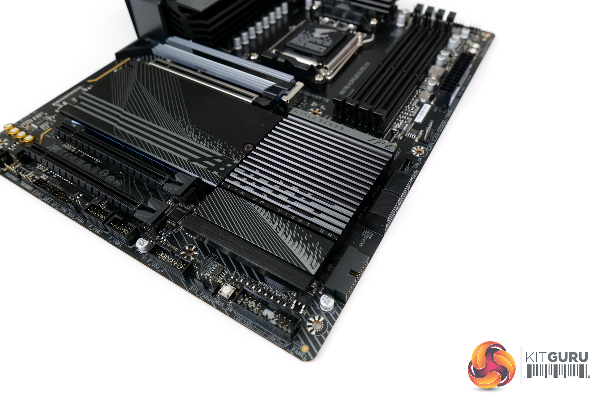 The top M.2 slots get its own cooling strip which is far smaller than the bigger Aorus boards, but should still suffice for handling an SSD.