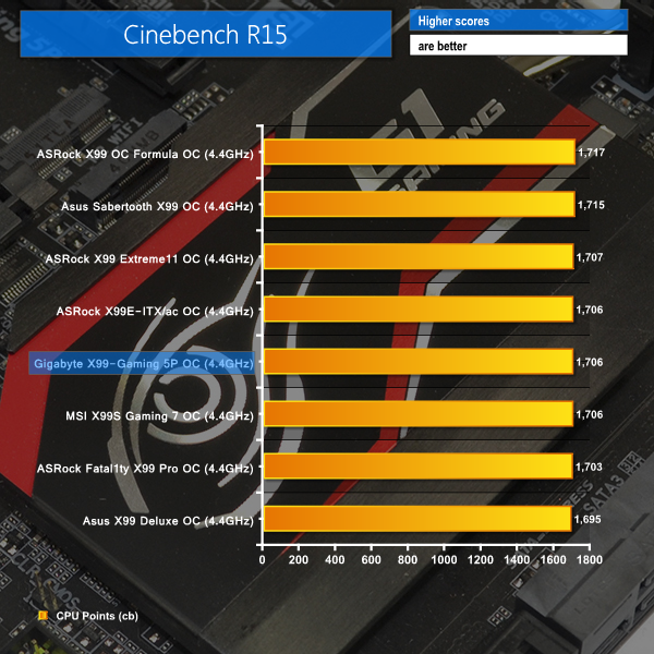 We will outline the performance increases that can be obtained from using the Gigabyte X99-Gaming 5P motherboard to overclock our system. Our overclocked processor frequency was 4.4GHz and memory speed was 2666MHz.