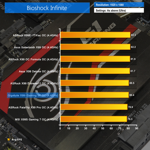 CPU-only overclocked performance continues the Gigabyte board's trend of being sat in the middle of our results chart. Cinebench and 3DMark Physics show sizeable gains from boosted CPU frequency, however Bioshock Infinite doesn't seem to care for greater clock speed.