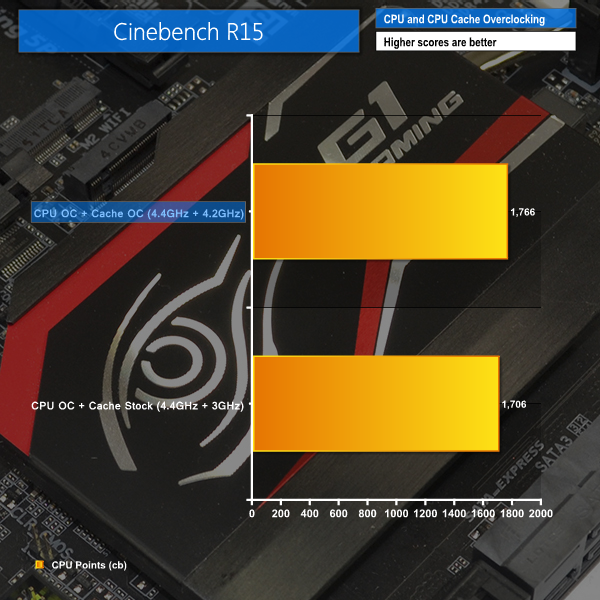 The CPU-heavy Cinebench workload delivers a noticeable boost in performance with the CPU cache/ring operating 1200MHz faster than its stock-clocked frequency. An extra 60 Cinebench points is a worthwhile performance improvements, even if the increased CPU cache/ring voltage forced higher power usage.