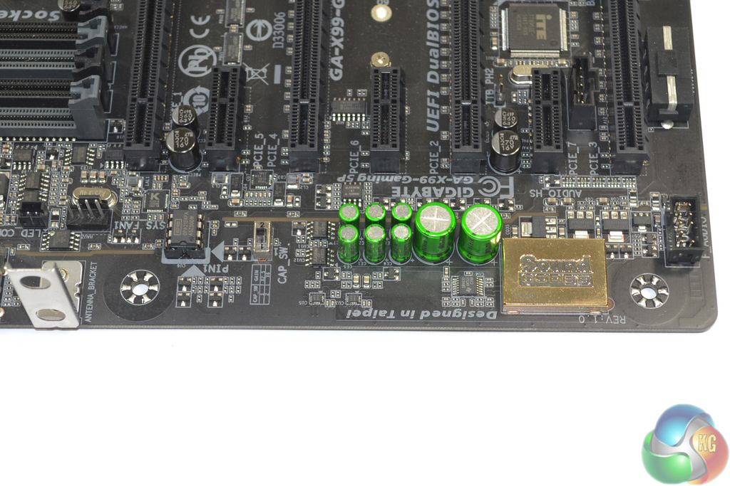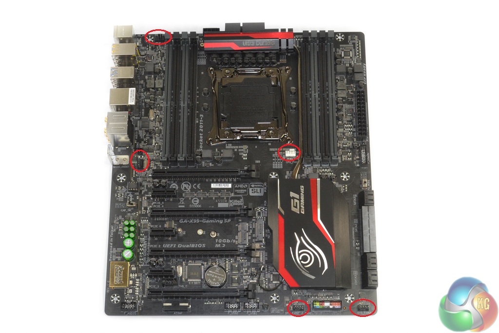Gigabyte’s PCIe slot layout is about as good as it gets for an X99 motherboard. There is a two-slot cooling gap between a pair of boards and three cards also line-up in preferable spacing arrangements.