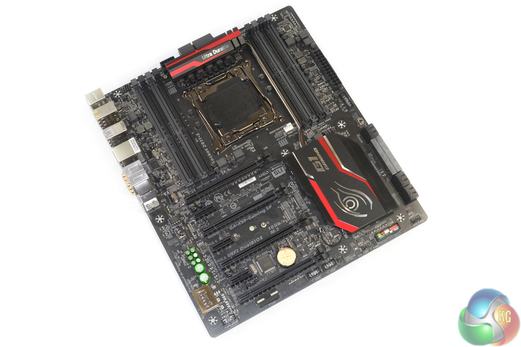 Gigabyte outfits the X99-Gaming 5P in the red and black scheme the company uses for its Gaming series components. Red touches on the heatsink contrast a largely black appearance.