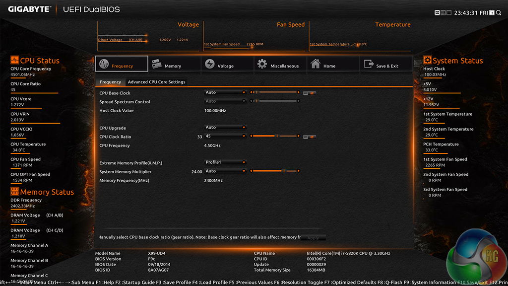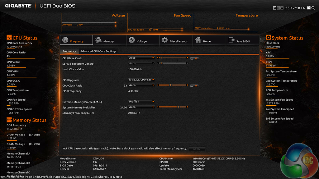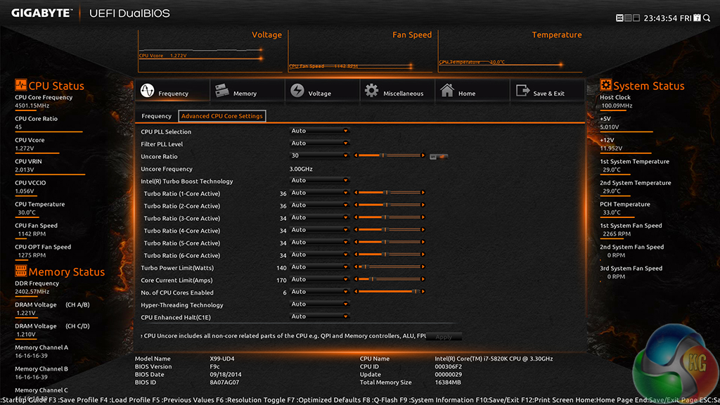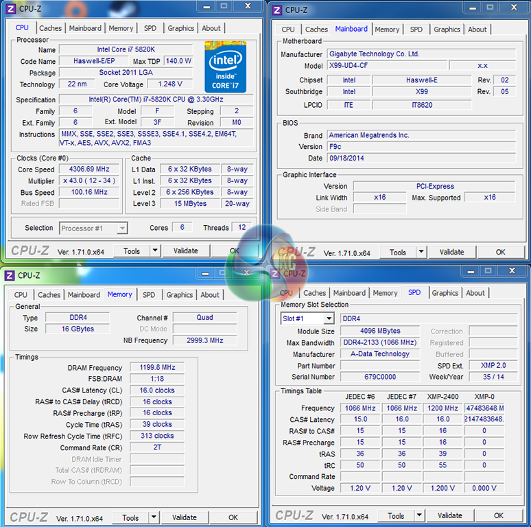 Gigabyte's automatic CPU speed-boosting profile had no problem taking our 5820K to 4.3GHz. We were happy to see that only the CPU speed level was adjusted, and the memory configuration was maintained in its XMP mode.