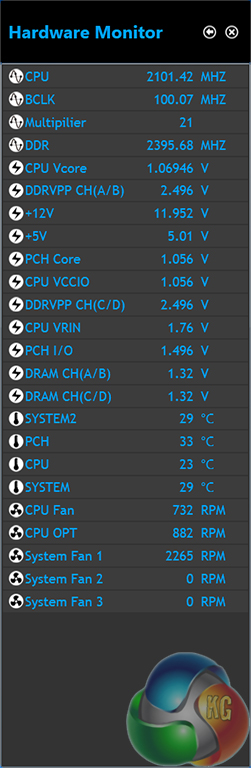 A larger list of system information readings is displayed on the Hardware Monitor break-out window.
