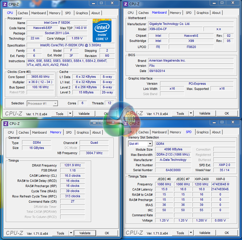 By default, the Gigabyte X99-UD4 motherboard applies multi-core turbo (MCT) and forces the 5820K to a constant 3.6GHz when XMP is enabled. This will be displayed as the ‘stock’ setting.