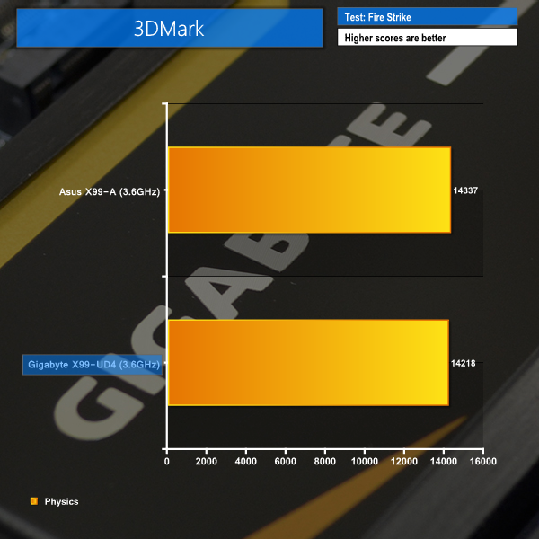 Gigabyte's X99-UD4 comes in 119 points behind the Asus competitor in the 3DMark physics test. Overall 3DMark score was also affected by the Gigabyte board's PCIe 2.0 link speed to our R9 280X graphics card.