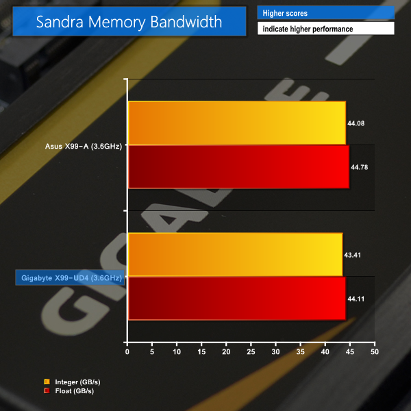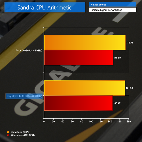 Performance between the Asus and Gigabyte budget-orientated motherboards is very close in Sandra benchmarks. Asus' X99-A takes a slight lead in terms of memory bandwidth and processor arithmetic scores, but the difference is practically negligible.