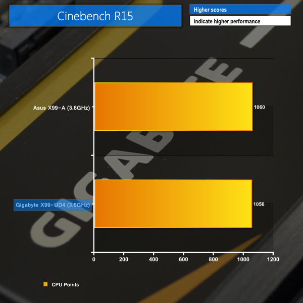 There is almost nothing to tell each motherboard apart in our CPU-related benchmarks. Gigabyte's X99-UD4 is narrowly beaten in the Cinebench and Handbrake tests, but the performance difference is too small to mean anything (0.38% for Cinebench and 0.32% for Handbrake).