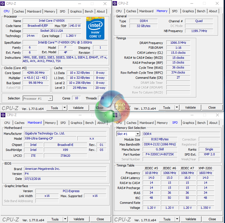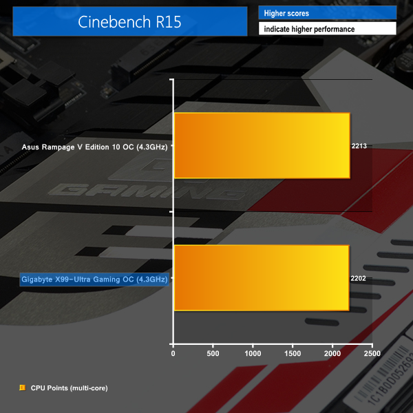 As a performance comparison, we have included the results from competing Asus X99 motherboards. The maximum overclocked configuration achieved with each board was a 4300MHz (43 x 100MHz) processor frequency and 3.4GHz CPU Cache speed, whilst using 3200MHz CL14 memory.