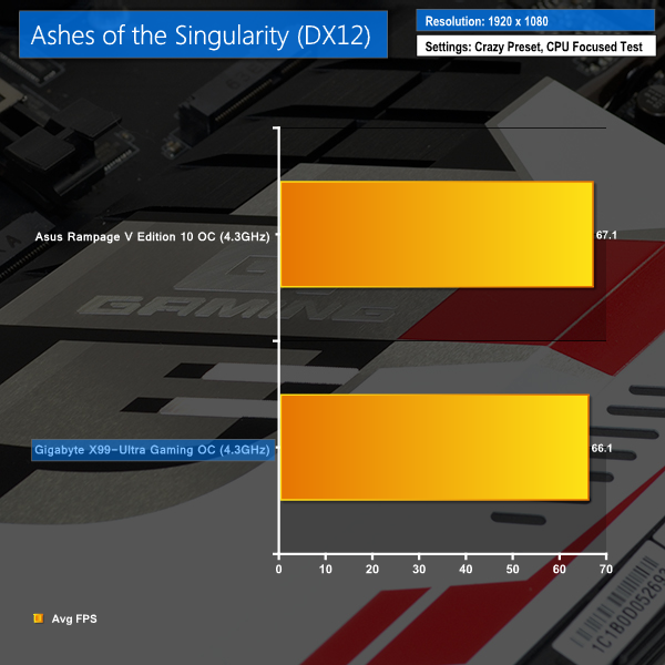 Gigabyte's X99-Ultra Gaming clearly holds its own when being used to overclock the system. Performance is largely identical to that of Asus' Rampage V Edition 10, with only Ashes of the Singularity sowing a slight negative performance gap for Gigabyte's significantly more affordable X99-Ultra Gaming.