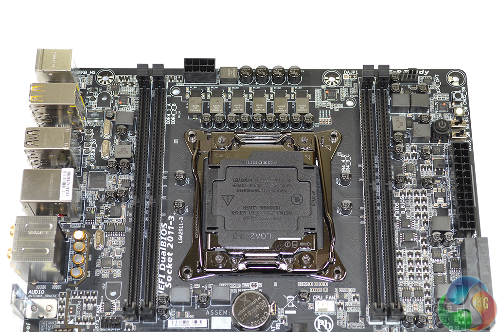 Needless to say, space around the large LGA 2011-3 CPU socket is tight. With a pair of the DDR4 DIMM slots residing closely to either side of the CPU socket, tall memory heatsinks and a large air cooler will not make a smart pairing.