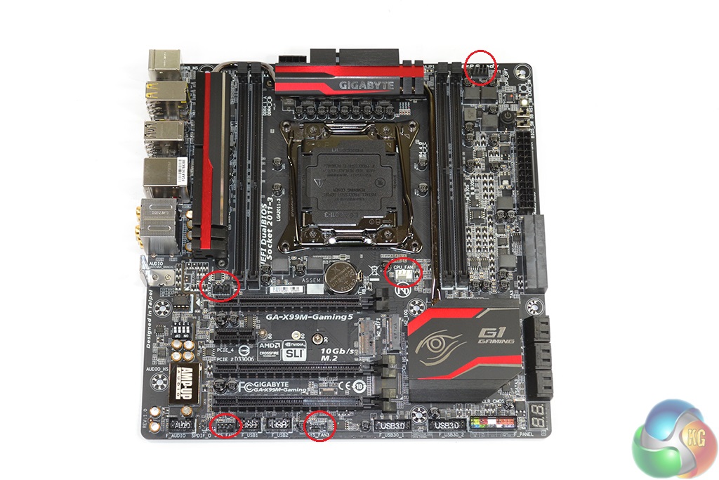 Distribution of Gigabyte's five 4-pin fan headers is very good. The two CPU headers are well within reach of the CPU socket, and chassis fans are covered by the three remaining headers which are found in smart locations.