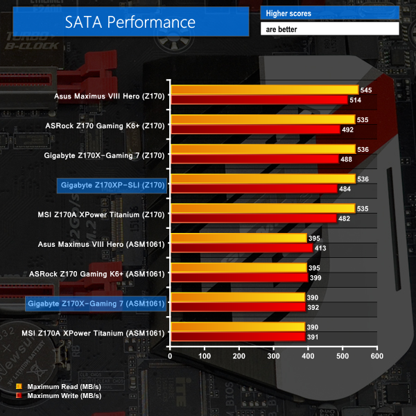 SATA performance from Gigabyte's board is where we would expect it to be. A SATA 6Gbps SSD connected to the Z170 chipset ports is unlikely to suffer any noticeable slowdowns, while connecting a high-speed drive to the ASM1061 connections will cause a bottleneck.