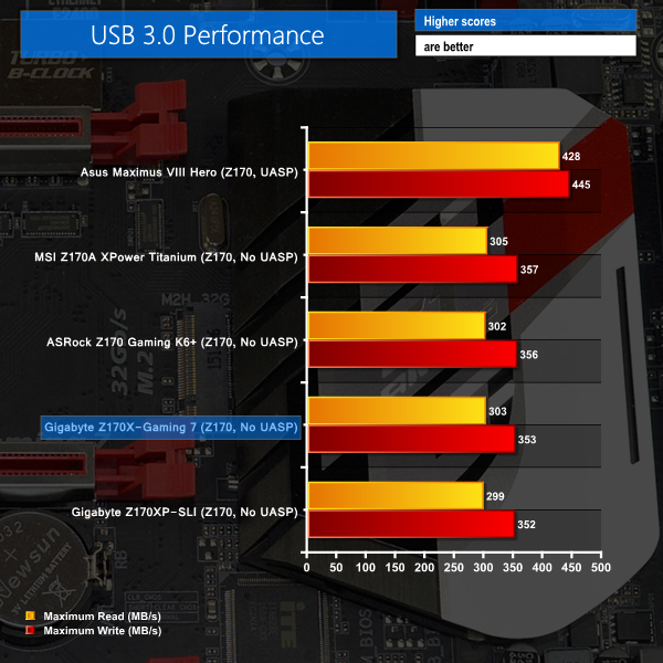 USB 3.0 transfer rates are what we would expect given the lack of UASP-activating software from Gigabyte for Windows 7 users. Windows 8.1 and Windows 10 users are likely to see USB 3.0 transfer rates closer to those of Asus' boards thanks to the built in UASP driver in those operating systems.