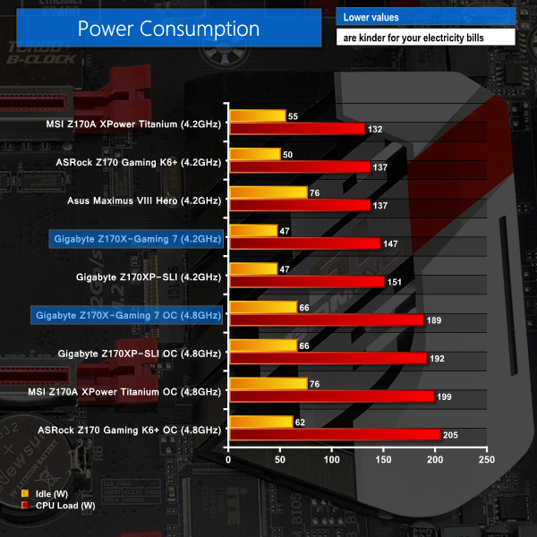Power consumption for the stock-clocked board is slightly swayed by our manual workaround to enable MCT-level performance. With that said, the idle power consumption numbers shown by Gigabyte's board are particularly impressive.