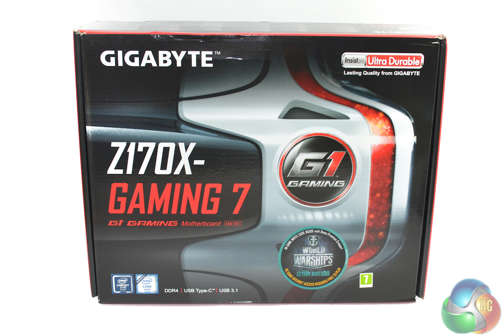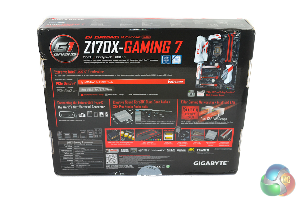 Gigabyte ships the Z170X-Gaming 7 in a box that highlights the board's core features and general specifications.