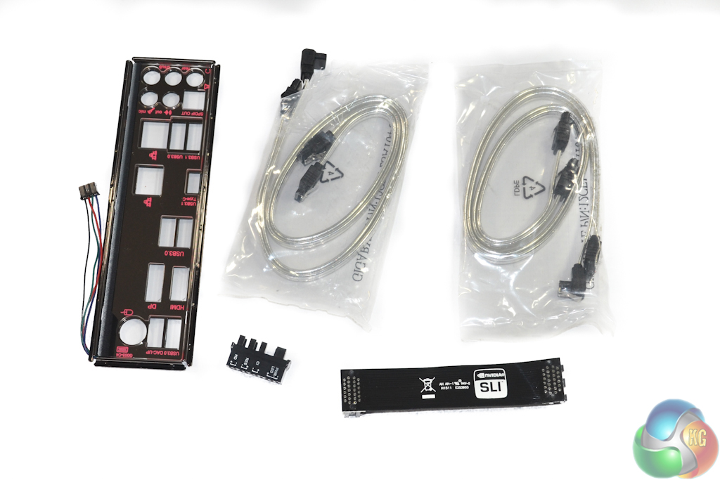 The decent bundle consists of four clear-coloured SATA cables, a black SLI ribbon, Gigabyte's chassis connector header, and an IO shield with active multi-colour lighting. I am happy to see Gigabyte supplying a plastic shroud that helps users connect the front panel chassis cables to their motherboard with relative ease.