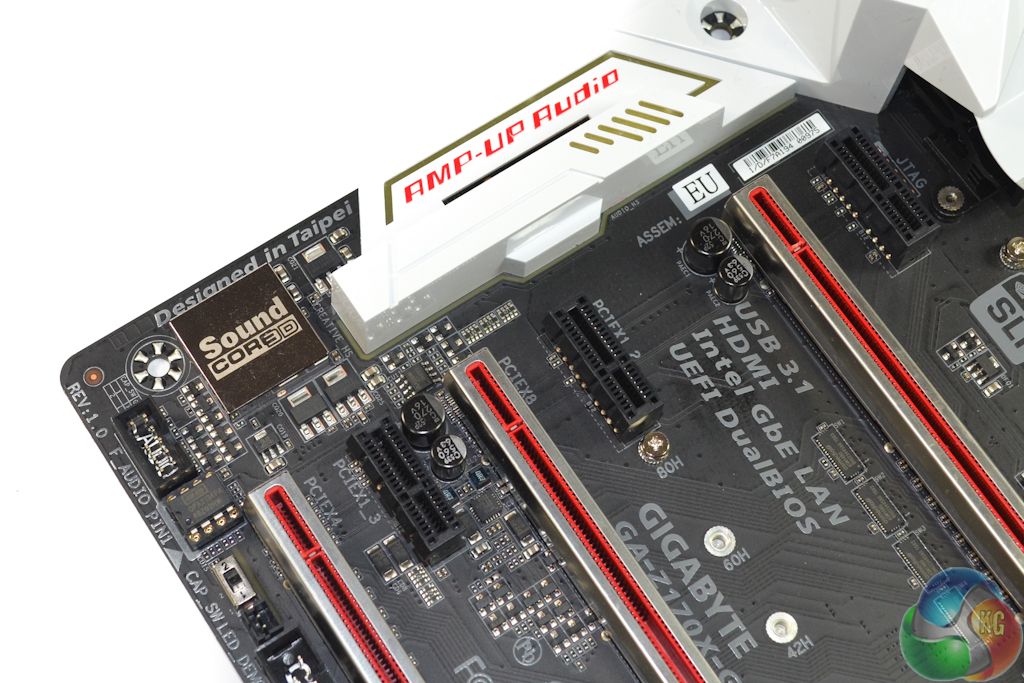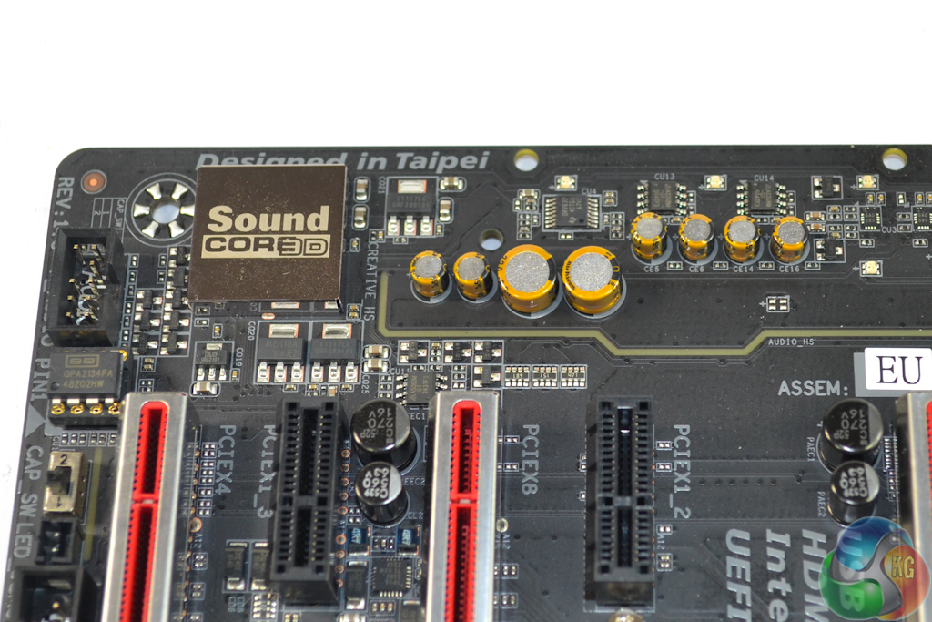 Gigabyte takes a different approach to that of competing motherboard vendors with its Amp-Up audio solution. The system is driven by a quad-core Creative Sound Core3D processor rather than Realtek's popular ALC 1150 codec. Used in tandem with Creative's SoundBlaster software, Gigabyte says that the dedicated audio processor removes a workload from the system's CPU.