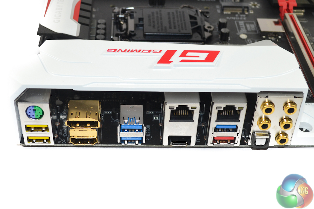 All three of the rear 5Gbps USB 3.0 ports derive from the Z170 chipset. Gigabyte advertises the yellow USB 2.0 connectors as USB DAC-UP ports, implying that they receive a cleaner power signal that helps to provide better performance to a USB DAC. The PS/2 connector is good to see for troubleshooting purposes. Gold-plated audio connectors help to reduce signal interference and aid port longevity.
