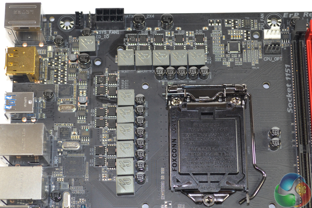 Spacing around the LGA 1151 CPU socket is sufficient for many large air coolers. Thanks to the relatively short stature of the VRM heatsinks, we had no interference issues or installation troubles when using the sizeable Noctua NH-D14 CPU cooler. A single 8-pin power connector drives the CPU and a Turbo B-Clock IC allows for significant changes to the CPU BCLK.