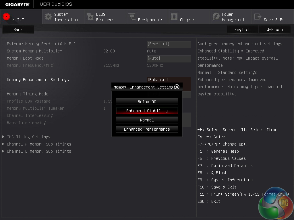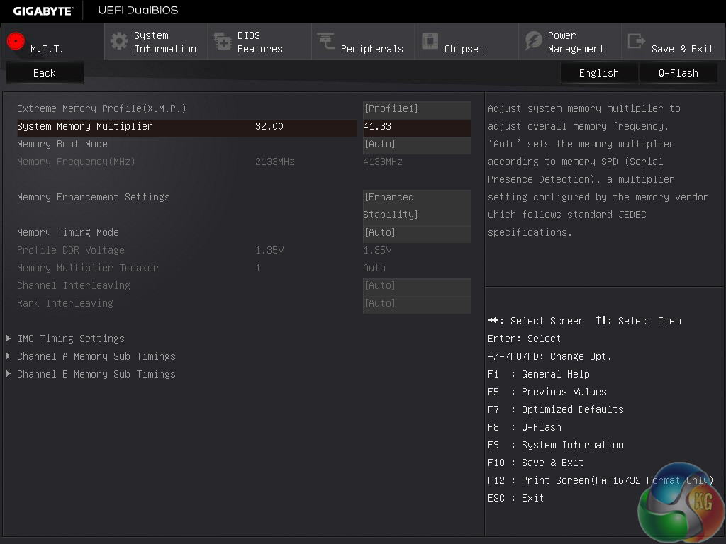 A memory ratio of up to 41.33x is supported in the Gigabyte UEFI. A multiplier this high may be useful for future memory kits or for tweaking the BCLK below 100MHz in order to stabilise a system overclock. A number of Memory Enhancement settings can be selected.