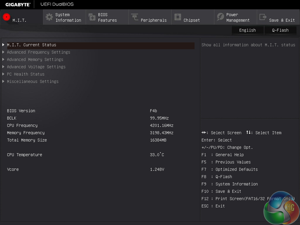 Entry point for Gigabyte's Z170 UEFI is the M.I.T page. This is the point where the main system operating functions, such as voltages, clock speeds, and fan controls, can be accessed.