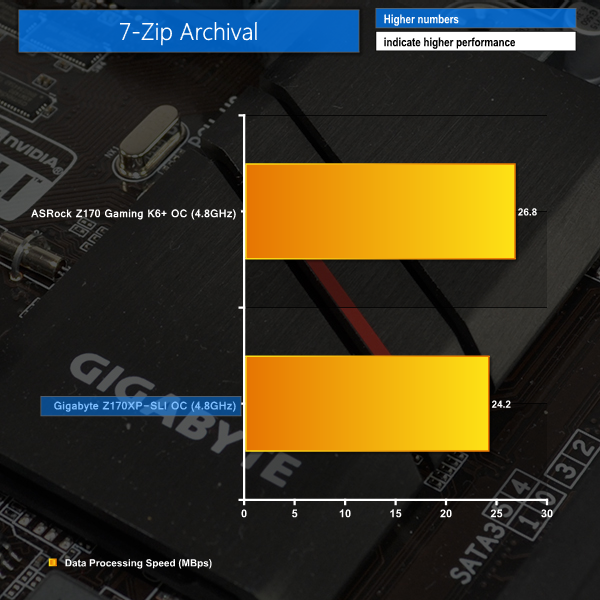 The same memory performance bug hampers the Z170XP-SLI motherboard's 7-Zip archival performance even when the CPU and cache frequencies are overclocked. Other than that, overclocked performance from Gigabyte's low-cost offering is generally a small percentage behind that of ASRock's higher-priced part.