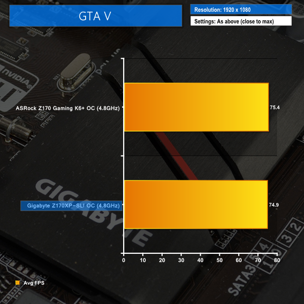 Using Gigabyte's Z170XP-SLI motherboard to overclock the system results in additional performance being unlocked. GTA V saw its average frame rate boosted slightly over the stock-clocked configuration, while the minimum frame rate saw a noticeable increase.