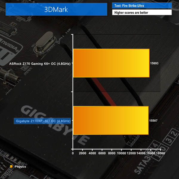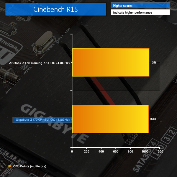 We will outline the performance increases that can be obtained from using the Gigabyte Z170XP-SLI motherboard to overclock our system. Our overclocked processor frequency was 4.8GHz and memory speed was maintained at 3200MHz.