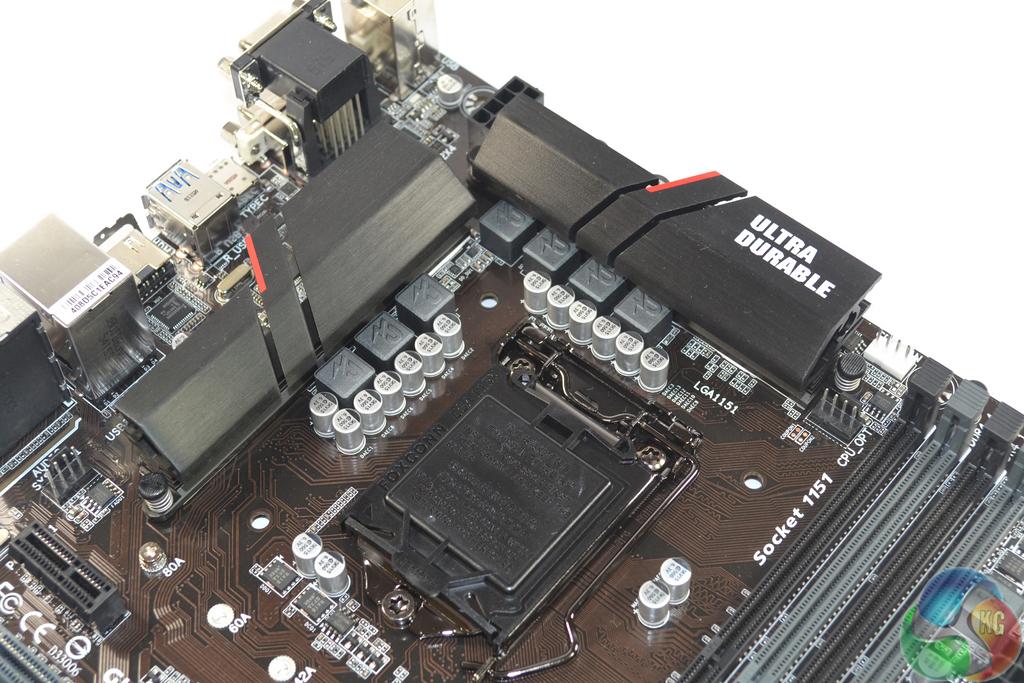 A total of seven power delivery phases (presumably in a six plus one configuration) are used to feed the LGA 1151 CPU and its integrated graphics core. There's no fancy branding for the MOSFETs, chokes, or capacitors, although Gigabyte does cool the power delivery components with a pair of metal heatsinks. The black blocks of metal are loosely held in place by a pair of spring-tension pins, so do not expect extreme cooling performance from these units.