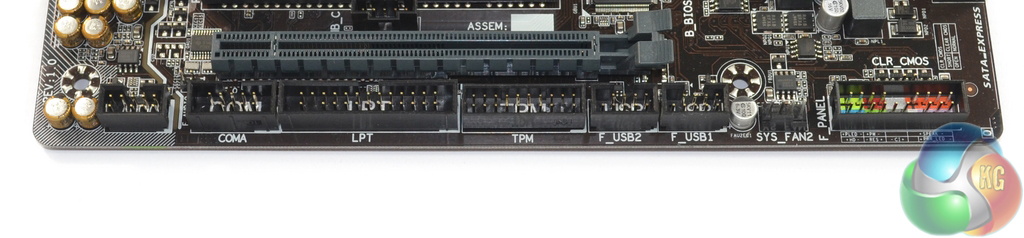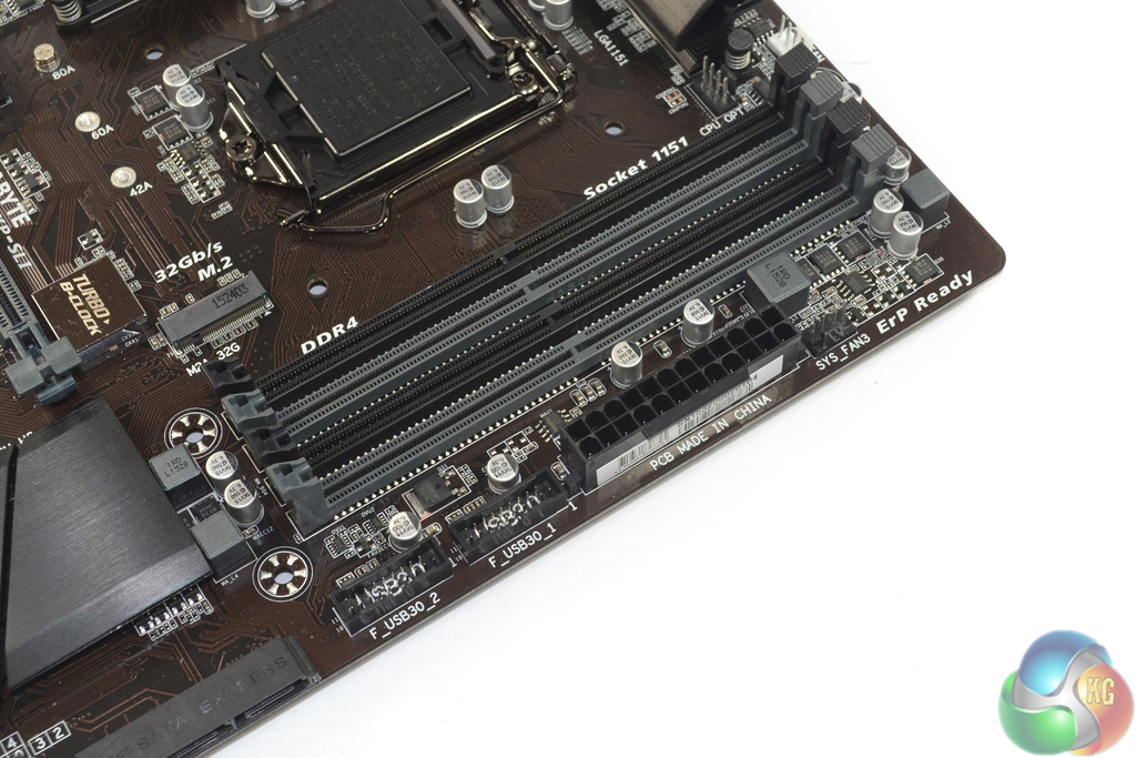 64GB of DDR4 memory can be installed in the four single-latch DIMM slots, with Gigabyte quoting frequency support of up to 3466MHz. Close to the memory slots are the 24-pin power connector and two outwards-facing USB 3.0 headers. Both of the USB 3.0 headers are served by the Z170 chipset's bank of 5Gbps ports.