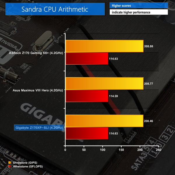 Solid performance is shown by Gigabyte's board in the 3DMark Physics and Sandra CPU arithmetic tests.