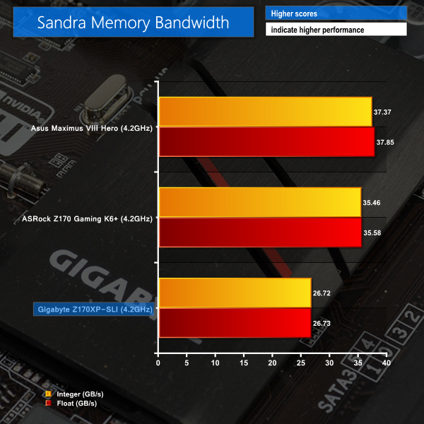 The Sandra memory bandwidth result is about 10GB/s off the mark of the competing pair, so this gives an indication that Gigabyte currently has a BIOS bug which is hampering memory performance.